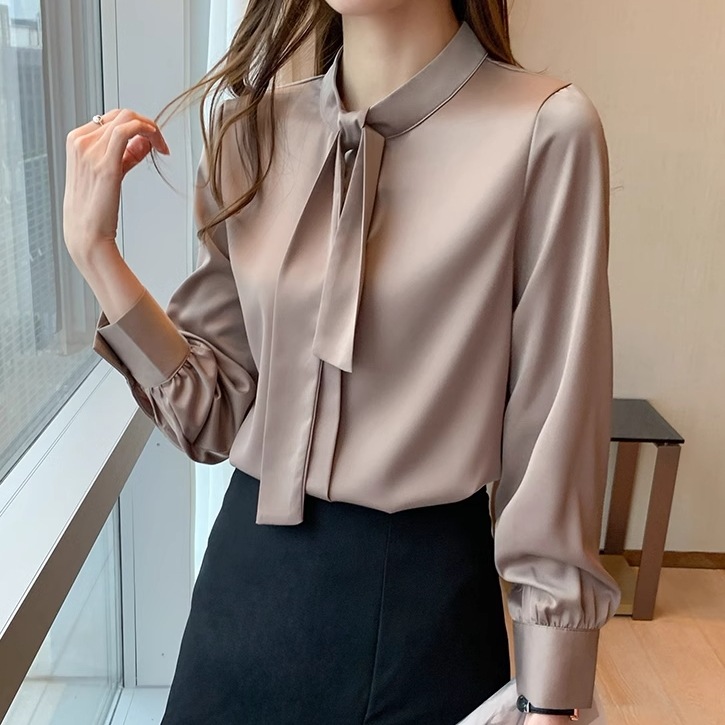 レディース トップス シャツ ブラウス サテンシャツ スタンドカラー 長袖 リボン サテン かわいい 大人可愛い きれいめ シンプル 上品 おしゃれ かっこいい レトロ こなれ感 ラフ ルーズ 個性的